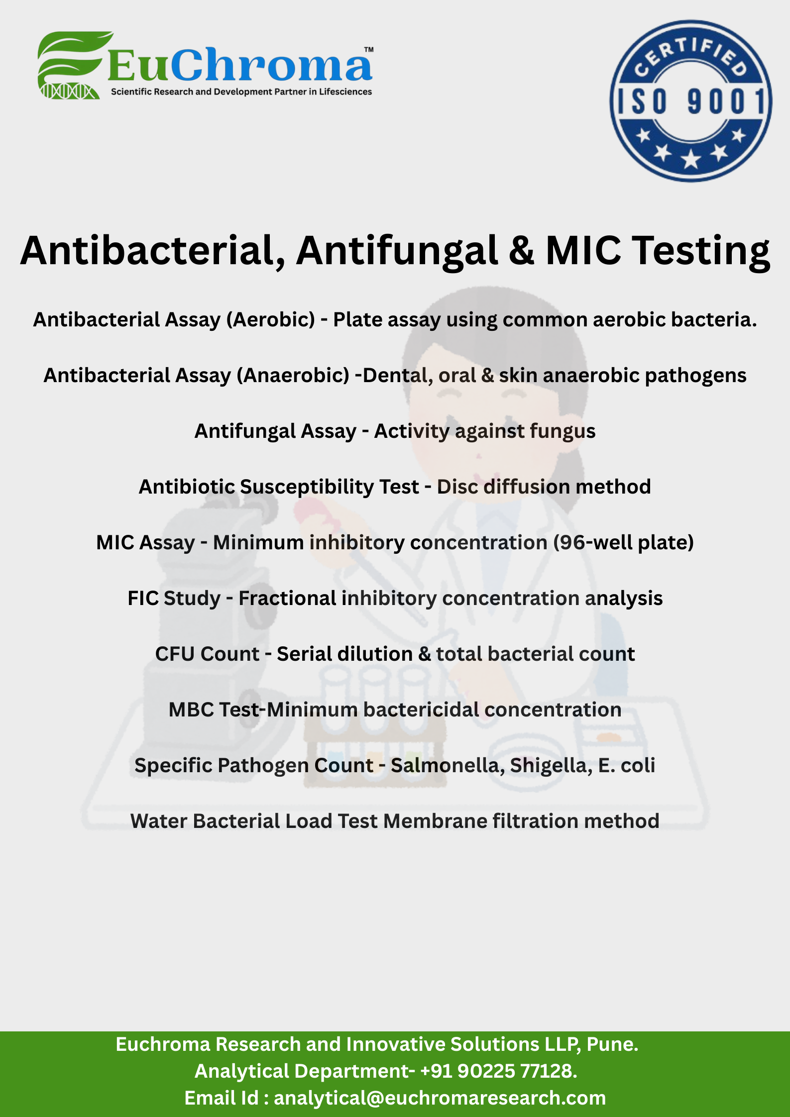 - Food Safety & Quality Compliance Testing – Ensuring microbial safety through standard tests.